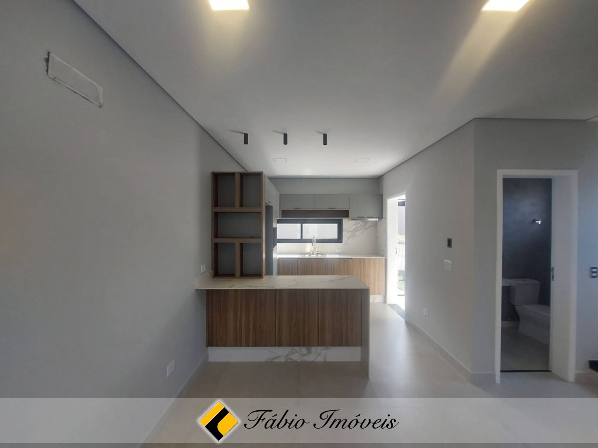 Sala ampla com portas balcão para a área de lazer, cozinha balcão americano integrada, com armários planejados em sua extensão, trazendo charme ao ambiente, lavanderia anexa e wc social, no piso térreo.