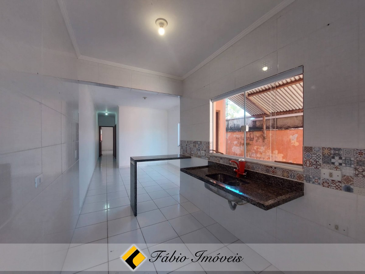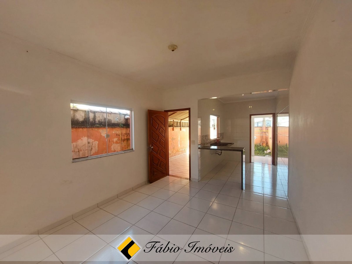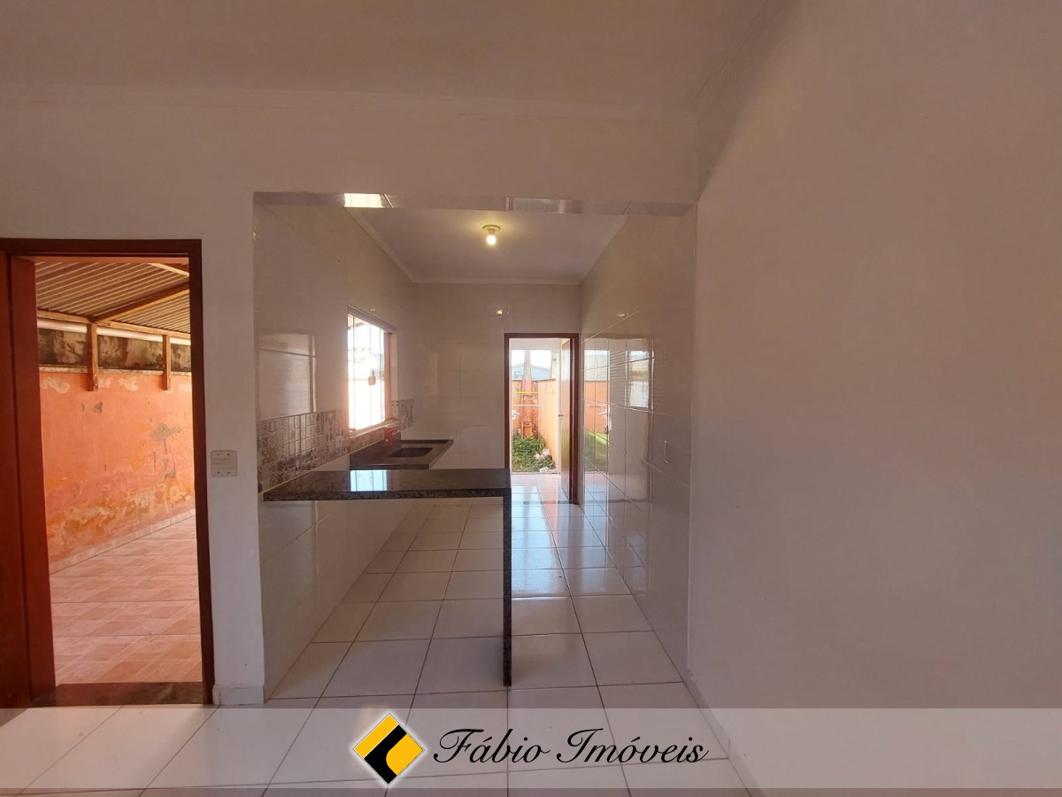 Casa com sala, cozinha balcão americano, lavanderia anexa, wc social, 2 dormitórios sendo 1 suíte, jardim e garagem para 2 autos.